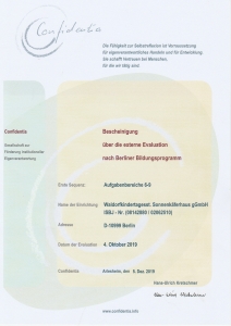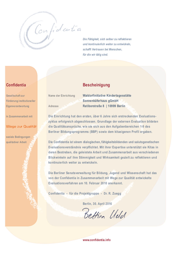 Begleitet und zertifiziert werden wir durch die Confidentia. Die Confidentia verfügt über eine Anerkennung der Berliner Senatsbehörde zur Durchführung von externen Evaluationen zum Berliner Bildungsprogramm für Kinder in Tageseinrichtungen bis zu ihrem Schuleintritt (BBP) – gemäß den Anforderungen der QVTAG (Qualitätsvereinbarung Tageseinrichtungen).